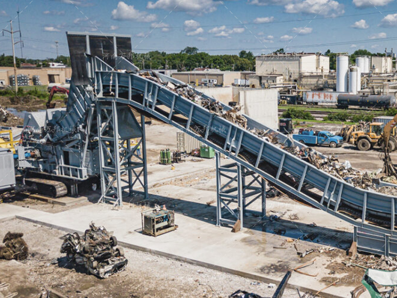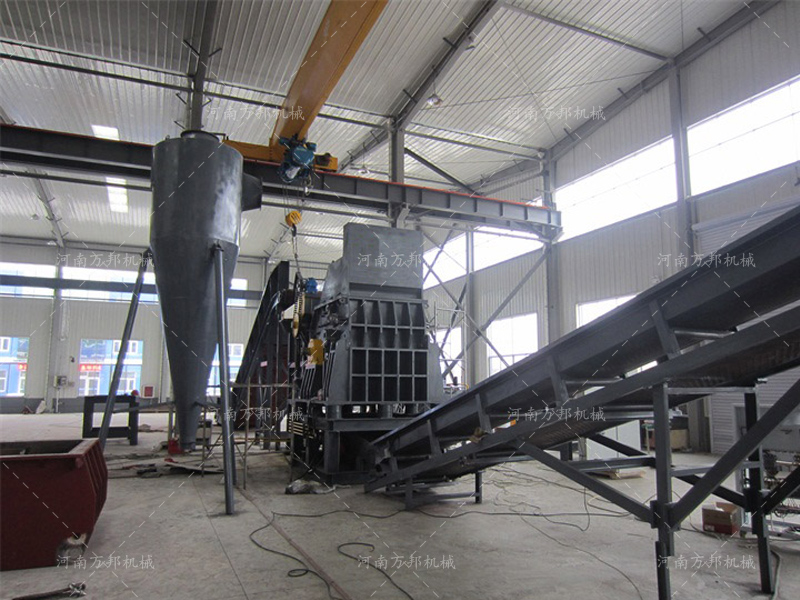 在金屬揉球機原理上物料通過上料輸送裝置廢鋼破碎機送料滑板物料通過強制壓料輥和擠壓輥將廢鐵中易燃易爆物料進行一次壓損防止物料產(chǎn)生爆炸,經(jīng)過一次壓損后的物料在二次壓料板的擠壓下被強制送入破碎機腔內(nèi),設(shè)備主軸在高速大扭矩電機的驅(qū)動下,主機轉(zhuǎn)子上的錘頭輪流擊打進入主機腔內(nèi)的金屬廢料進行擊打、揉搓、撕裂加工將廢鐵中依附的雜質(zhì)、油漆、油污進行清除最終將廢鋼一次性加工成球狀團粒經(jīng)過設(shè)備底部篩網(wǎng)卸除完成破碎過程,經(jīng)過破碎后的物料經(jīng)設(shè)備底部震動給料機均勻的送入出料皮帶輸送機經(jīng)過磁力分選后將廢鋼中的雜質(zhì)與鋼鐵進行分離從而完成整個破碎作業(yè),該設(shè)備除了配備以上設(shè)施外還配備有隔音房、除塵系統(tǒng),在設(shè)備結(jié)構(gòu)上可見下圖: